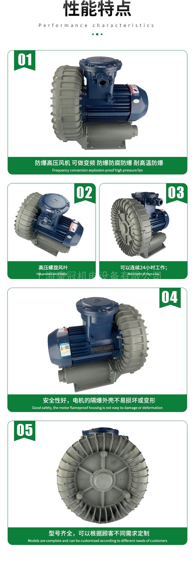 详细信息| 询价留言加工定制:是 品牌:BT4 型号:EX-B-3 电流:3.4 A 温控范围:80 输入功率:2.2 w 尺寸:- cm 风量:300 m3/h 适用范围:易燃易爆气体输送 重量:50 ㎏ 风量:300 m3/h 适用范围:易燃易爆气体输送 EX防爆鼓风机机械精密度高,回转部分之零件均经过极精密之平衡设计,测试、校正,所以震动率很低,采用散热良好好之多翼式铝合金散热壳,能够快速散热以加强马达运转效率。本体与马达外壳分开铸造。风机叶轮与轴部间,采用密封防尘设计,可防止尘土设计进入,加长使用年限。